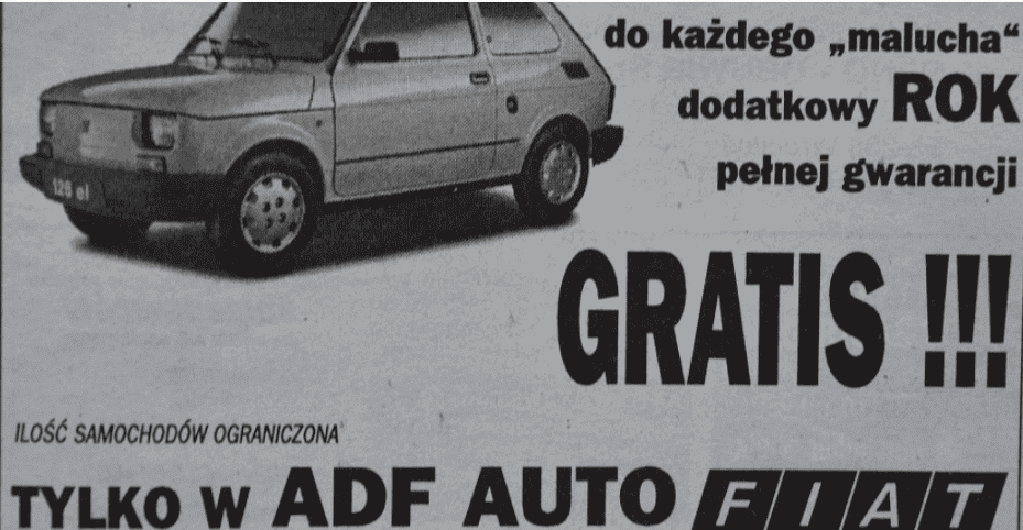 Według tej reklamy każdy samochód „maluch” był objęty dodatkowym rokiem pełnej gwarancji. W Polsce słowo to jest powszechnie używane do określenia małego samochodu, Fiata 126, produkowanego w Polsce, który kojarzy się z kompaktowością i oszczędnością. Reklama ma na celu przyciągnięcie klientów dodatkowym rokiem obsługi gwarancyjnej tego samochodu. Dodano, że liczba samochodów jest ograniczona, co już tworzy pewną ekscytację i poczucie pilności.