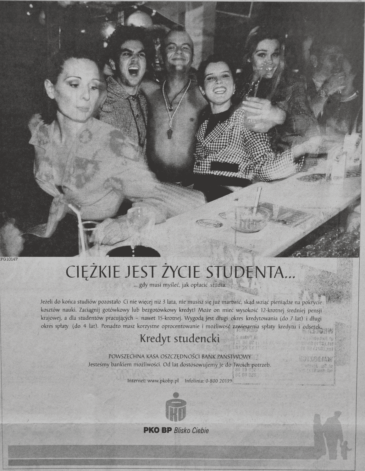 Ta reklama oferuje korzystną opcję pożyczki dla studentów, którzy muszą płacić za studia w przerwach między zabawnymi imprezami. Zdjęcie w gazecie i nagłówek „Ciężkie życie studenta” tworzą ironiczny ton, ale reklama jest całkiem poważna, jeśli chodzi o korzyści płynące z zaciągnięcia pożyczki w konkretnym banku. Podany jest nie tylko numer telefonu instytucji, ale także adres jej strony internetowej, co w tamtym czasie dodawało reklamie wagi.
