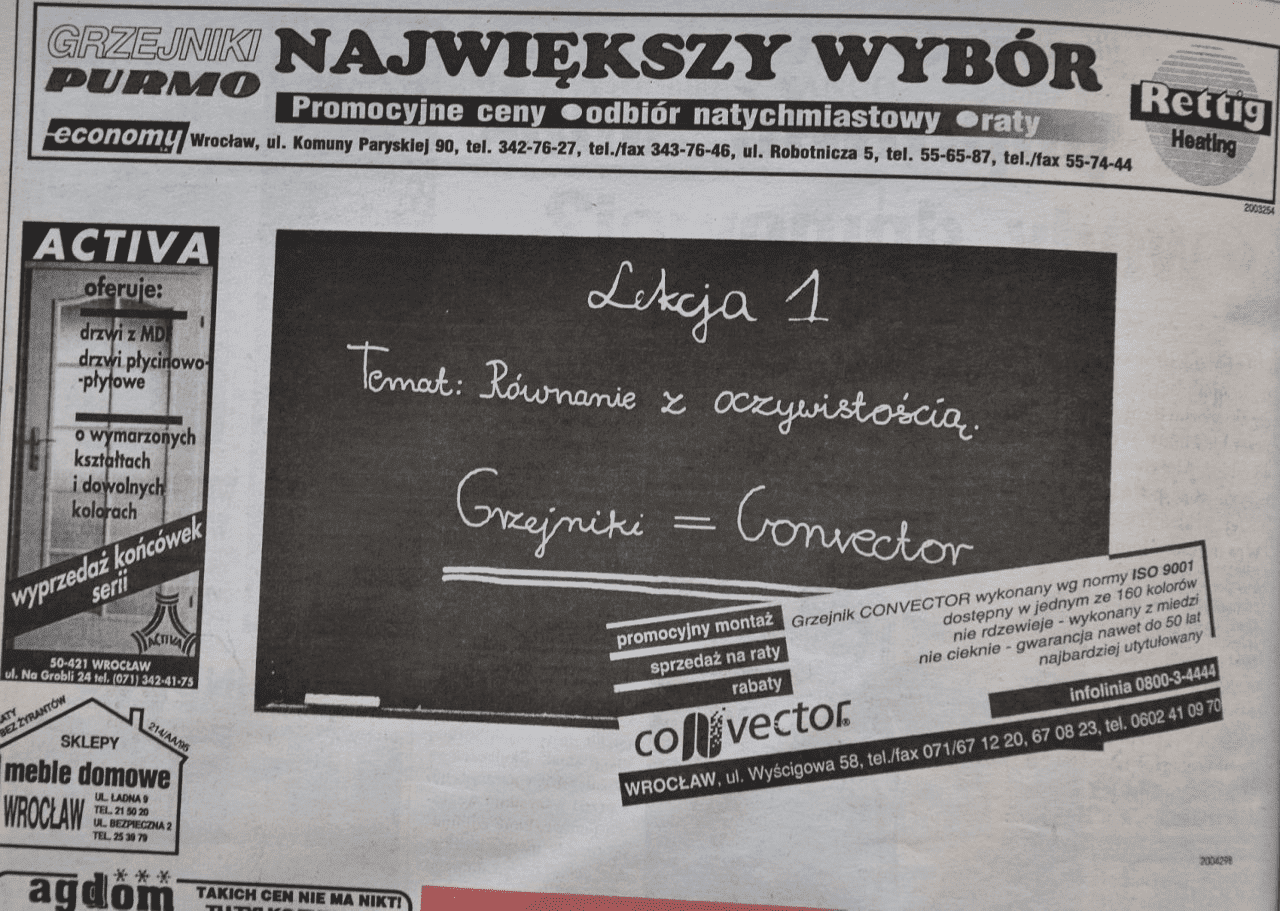 Kolejna reklama, konwektora, prezentuje pewien poziom kreatywności typowy dla lat 90. Zawiera zwroty reklamowe, które w dzisiejszych czasach trącą naiwnością, ale nadal są używane, choć w bardziej zaawansowanej wersji oferty.