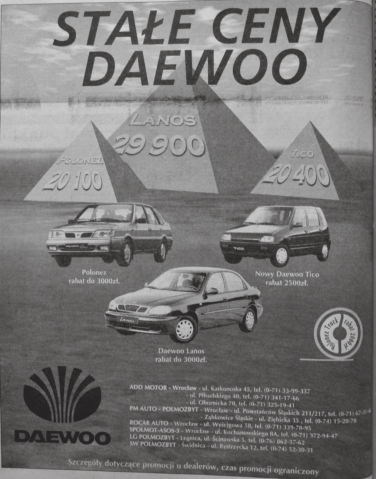 Istotą tej reklamy jest oferowanie stałych cen na niektóre modele samochodów Daewoo. Zdecydowanie wygląda to trochę dziwnie jak na nasze czasy, ale ideę można zrozumieć, jeśli weźmie się pod uwagę następującą sytuację typową dla lat 90.: osoba chce kupić samochód, oszczędza pewną kwotę pieniędzy, a następnie dowiaduje się, że cena została podniesiona. W przeciwieństwie do zmiennych cen innych producentów, Daewoo oferuje stałą cenę, zachęcając do szybkiej decyzji stwierdzeniem, że czas promocji jest ograniczony.