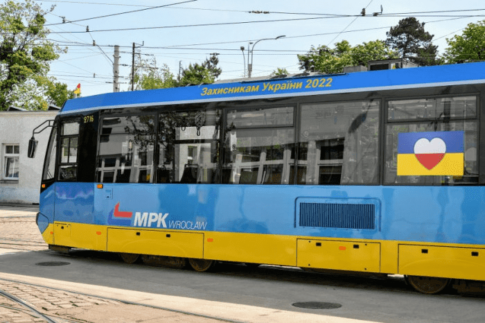 Wrocławskie tramwaje na przestrzeni historii zmieniały swoje barwy. Po II wojnie światowej były niebieskie, w latach 1950-tych czerwono-żółte, a od 1973 roku tradycyjnie niebiesko-białe. W maju 2022 roku jeden z wrocławskich tramwajów zmienił kolor na niebiesko-żółty. Zrobiono to na cześć poparcia dla Ukrainy przeciwko agresywnej wojnie rozpoczętej przez rosję w lutym 2022 roku. Tramwaj symbolizuje przyjaźń ukraińsko-polską. Nad drzwiami zostały umieszczone napisy w dwóch językach: „Obrońcom Ukrainy 2022”, „Jesteśmy z wami”, „Chwała Ukrainie”. Na oknach zostały umieszczone naklejki z biało-czerwonymi sercami, które oznaczają serdeczną solidarność.