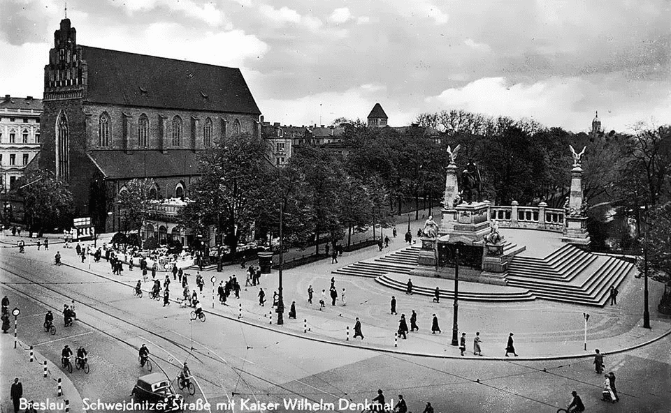 Ulica Świdnicka, miejsce dawnej Bramy Świdnickiej. Od 1896 roku stała tu 6-metrowa konna rzeźba cesarza Wilhelma I. Dwie postacie obok pomnika symbolizowały Sztukę Wojenną i Służbę Narodowi, natomiast płaskorzeźba na pomniku przedstawiała niemieckich książąt składających hołd Niemcom.