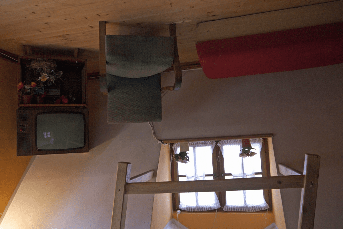 Чтобы попасть в необычное здание, надо пройти через окно. Попав внутрь, посетители часто теряют равновесие, поскольку мозг не сразу может привыкнуть к такому положению вещей. И это действительно очень странно, когда люстра стоит на полу, а стулья, стол и другие вещи — над головой на потолке. Больше всего поражают настоящие живые цветы в горшках, которые тоже растут сверху вниз. Когда немного приходишь в себя, становится интереснее, и возникает желание все подробно рассмотреть. Интерьер дома неприхотлив, поскольку сделан он в стиле 70-х годов, то есть во времена Польской Народной Республики. В духе социализма в нем есть гостевая комната с телевизором, сервантом с настоящим хрустальным сервизом, как символом тогдашнего достатка, и даже туалет. В то время минимализм в стиле оформления был не прихотью владельцев, а суровой реальностью. Это положение вещей и постарались воспроизвести авторы проекта.