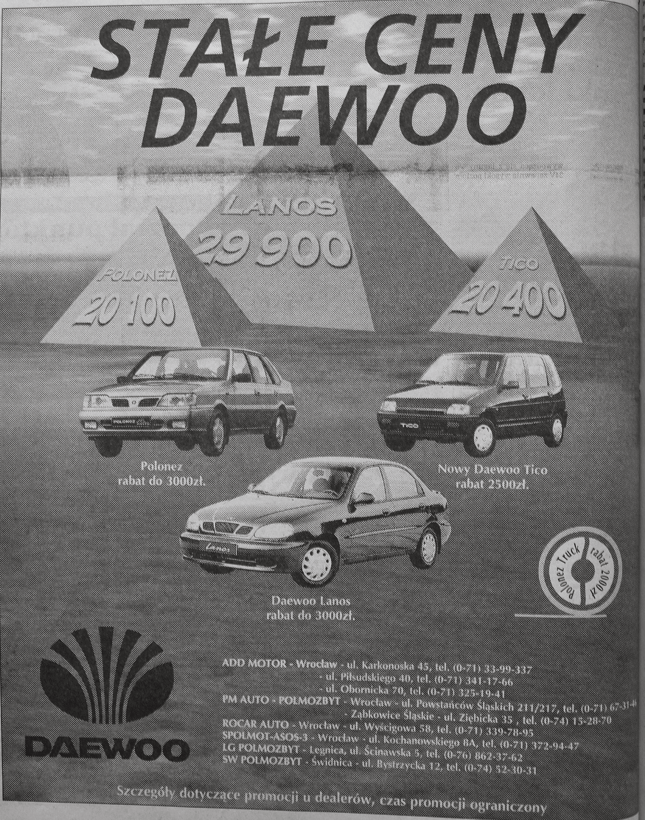 Суть этого объявления заключается в предложении фиксированных цен на определенные модели автомобилей Daewoo. Оно точно выглядит немного странно для наших времен, но понять идею можно, если учесть такую характерную для 1990-х ситуацию: человек хочет купить машину, накапливает определенную сумму, а потом узнает, что цену подняли. В противовес меняющимся ценам от других производителей, Daewoo предлагает фиксированную стоимость, побуждая к быстрому принятию решения фразой о том, что время промоакции ограничено.